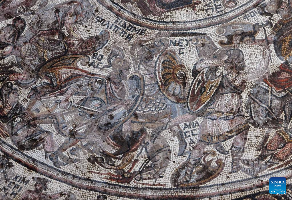 Photo taken on Oct. 12, 2022 shows part of a Roman-era mosaic panel in al-Rastan, Homs, Syria. A well-preserved Roman-era mosaic panel was discovered in a residential suburb in the Syrian central province of Homs, local antiquities authorities announced on Wednesday. (Photo by Ammar Safarjalani/Xinhua)