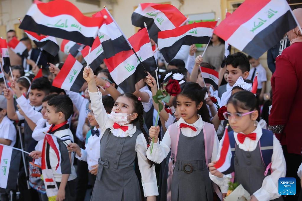 Students wave national flags on the first day of the new school year in Baghdad, Iraq, Oct. 12, 2022. (Xinhua/Khalil Dawood)