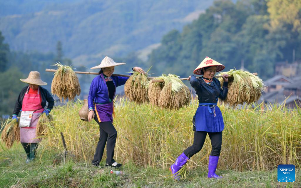 Women carry paddy rice at Zhanli Village of Congjiang County, southwest China's Guizhou Province, Oct. 12, 2022. (Xinhua/Yang Wenbin)