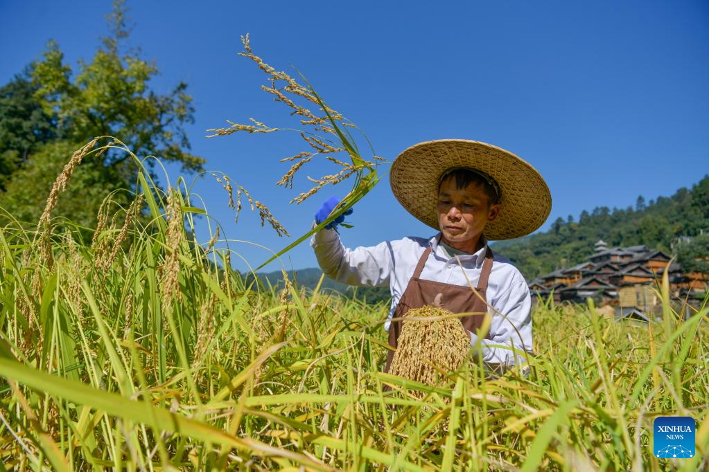 A man harvests paddy rice at Zhanli Village of Congjiang County, southwest China's Guizhou Province, Oct. 12, 2022. (Xinhua/Yang Wenbin)