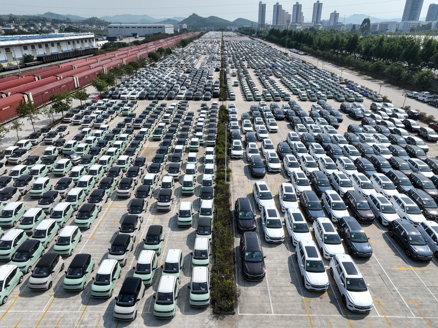 Aerial photo taken on Sept. 27, 2022 shows a new energy vehicles parking lot at a railway freight center in Liuzhou City, south China's Guangxi Zhuang Autonomous Region. (Xinhua/Zhang Ailin)