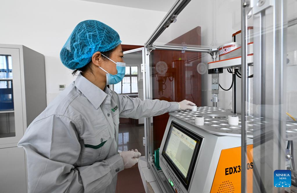 A staff worker conducts heavy metal content test in grain at Dagang branch of Central Grain Reserve Tianjin Dongli Direct Warehouse Co., Ltd. in north China's Tianjin, Oct. 12, 2022. Affiliated to China Grain Reserves Group (Sinograin), Central Grain Reserve Tianjin Dongli Direct Warehouse Co., Ltd. mainly stores wheat and corn with a total storage capacity of about 500,000 tons, which is the largest central grain reserve depot in Tianjin.