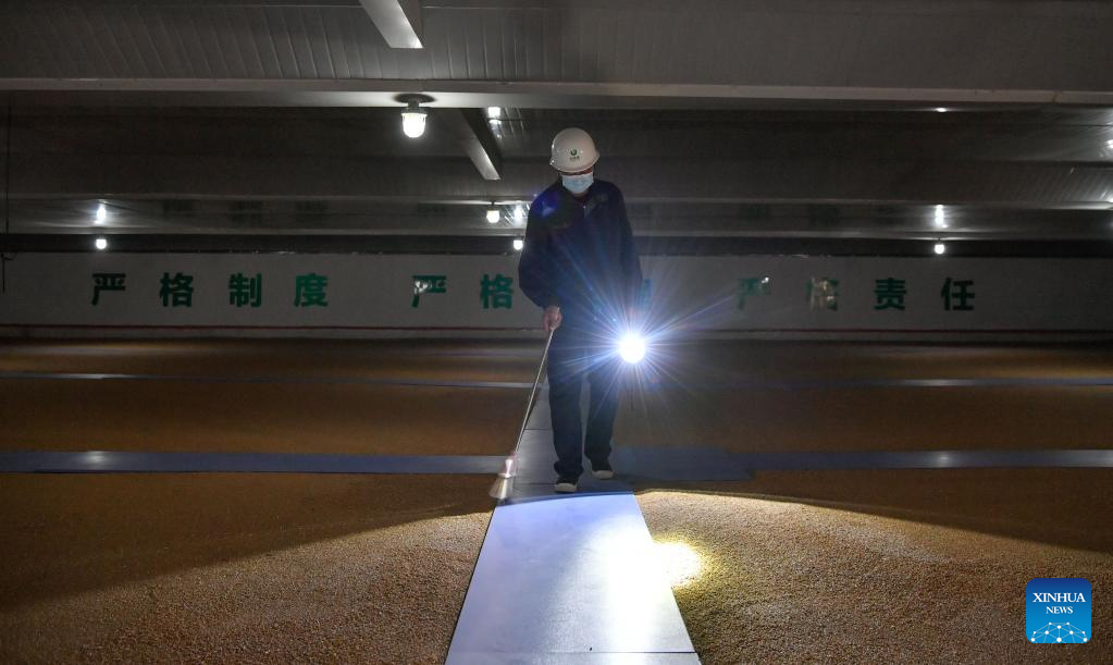 A staff worker inspects the warehouse at Dongli branch of Central Grain Reserve Tianjin Dongli Direct Warehouse Co., Ltd. in north China's Tianjin, Oct. 12, 2022. Affiliated to China Grain Reserves Group (Sinograin), Central Grain Reserve Tianjin Dongli Direct Warehouse Co., Ltd. mainly stores wheat and corn with a total storage capacity of about 500,000 tons, which is the largest central grain reserve depot in Tianjin.
