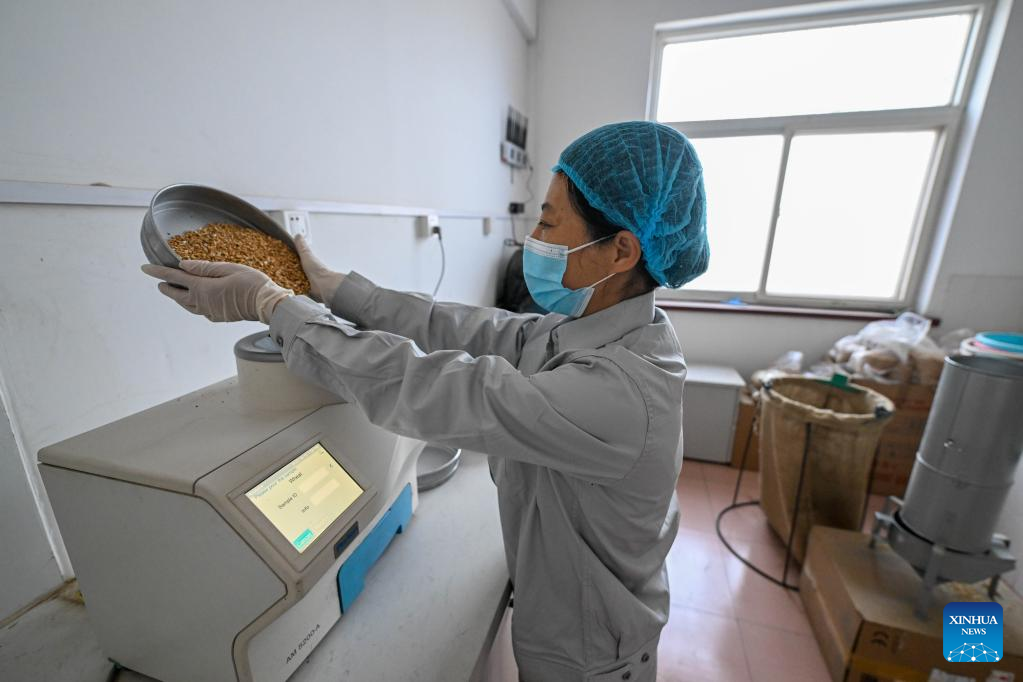 A staff worker conducts grain moisture content test at Dagang branch of Central Grain Reserve Tianjin Dongli Direct Warehouse Co., Ltd. in north China's Tianjin, Oct. 12, 2022. Affiliated to China Grain Reserves Group (Sinograin), Central Grain Reserve Tianjin Dongli Direct Warehouse Co., Ltd. mainly stores wheat and corn with a total storage capacity of about 500,000 tons, which is the largest central grain reserve depot in Tianjin.