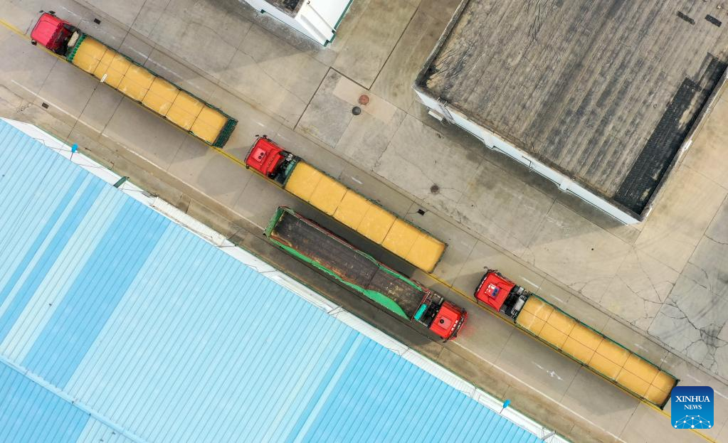 Aerial photo shows trucks loaded with grain at Dagang branch of Central Grain Reserve Tianjin Dongli Direct Warehouse Co., Ltd. in north China's Tianjin, Oct. 12, 2022. Affiliated to China Grain Reserves Group (Sinograin), Central Grain Reserve Tianjin Dongli Direct Warehouse Co., Ltd. mainly stores wheat and corn with a total storage capacity of about 500,000 tons, which is the largest central grain reserve depot in Tianjin.