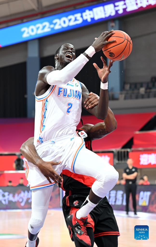 Thon Maker (Top) of Fujian Sturgeons competes during the 2nd round match between Fujian Sturgeons and Jiangsu Dragons at the 2022-2023 season of the Chinese Basketball Association (CBA) league in Hangzhou, east China's Zhejiang Province, Oct. 13, 2022. (Xinhua/Chen Zhenhai)