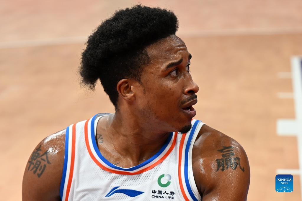 Tyrus McGee of Fujian Sturgeons reacts during the 2nd round match between Fujian Sturgeons and Jiangsu Dragons at the 2022-2023 season of the Chinese Basketball Association (CBA) league in Hangzhou, east China's Zhejiang Province, Oct. 13, 2022. (Xinhua/Chen Zhenhai)