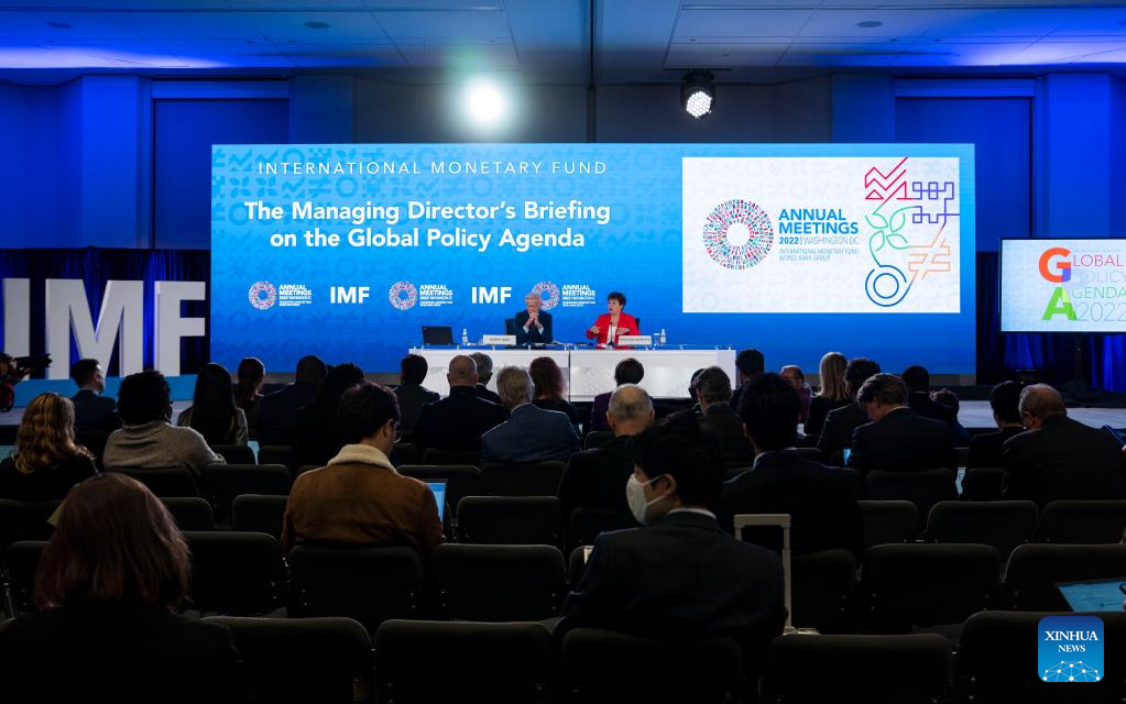IMF Managing Director Kristalina Georgieva (R, Rear) speaks at a press conference in Washington, D.C., the United States, on Oct. 13, 2022. Emerging markets and developing countries are being hit by a stronger dollar, high borrowing costs, and capital outflows -- a triple blow particularly heavy for countries that are under a high level of debt, the chief of the International Monetary Fund (IMF) said Thursday. (Xinhua/Liu Jie)