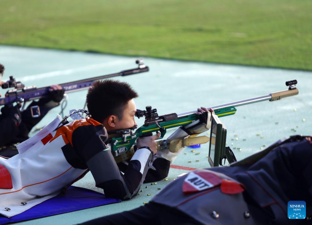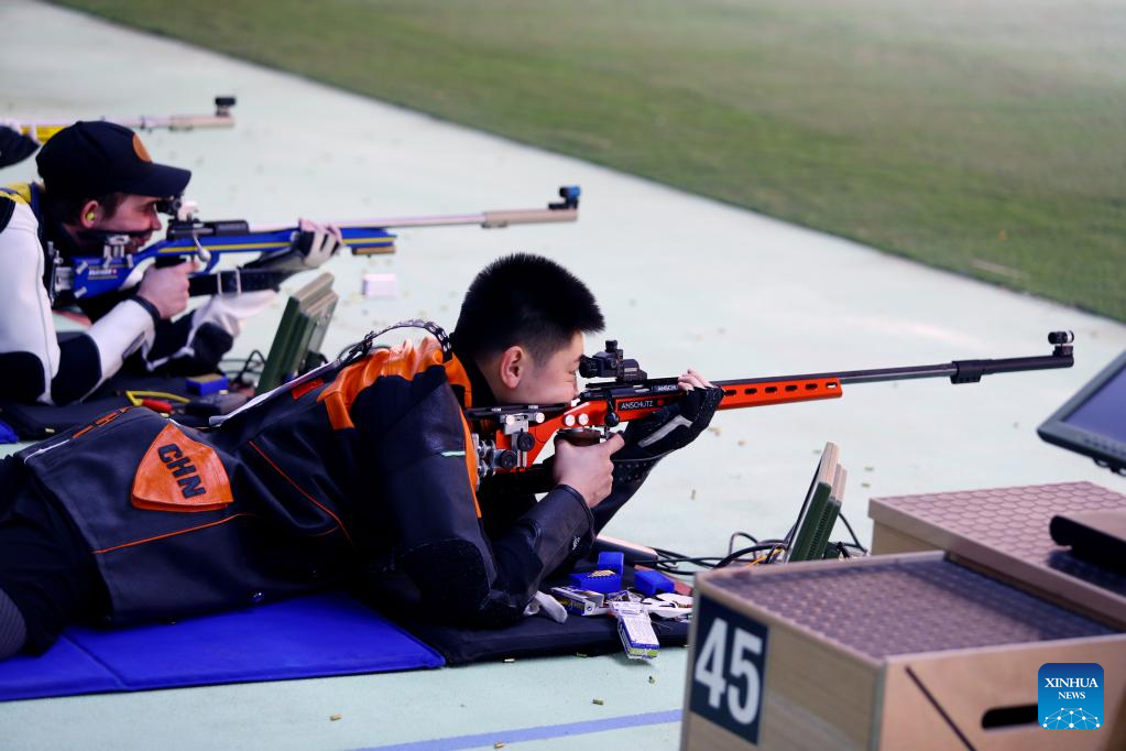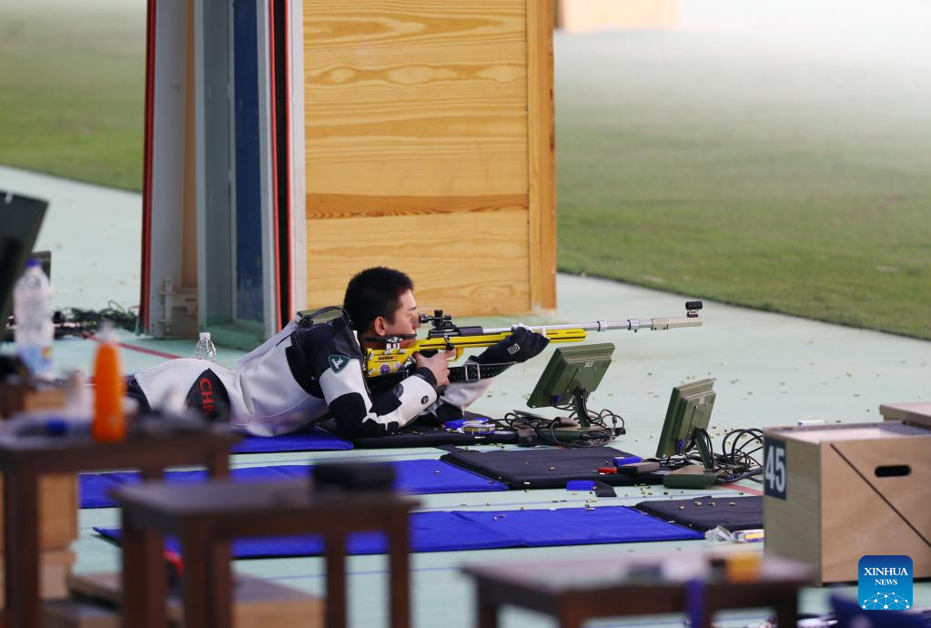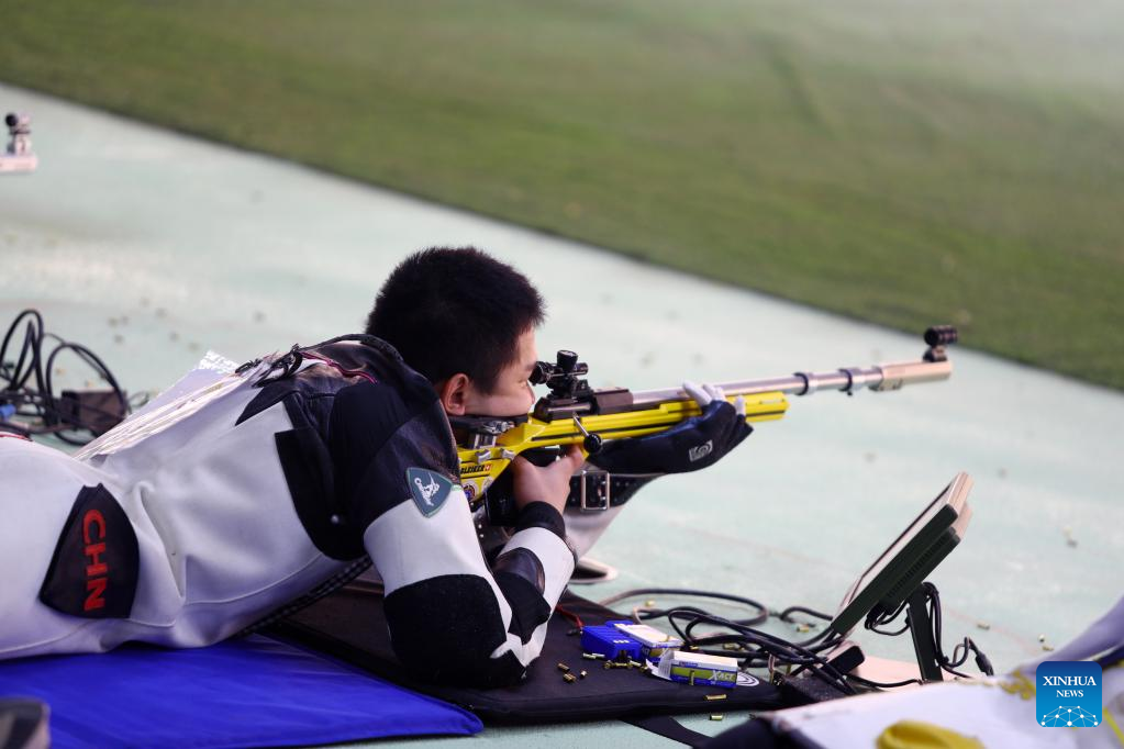 Du Linshu of China competes during the 50m rifle prone men junior individual match at the ISSF World Championship Rifle/Pistol in Cairo, Egypt, Oct. 13, 2022. (Xinhua/Ahmed Gomaa)
