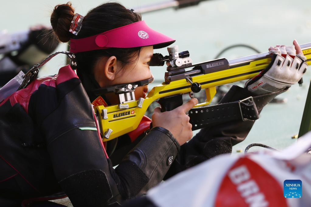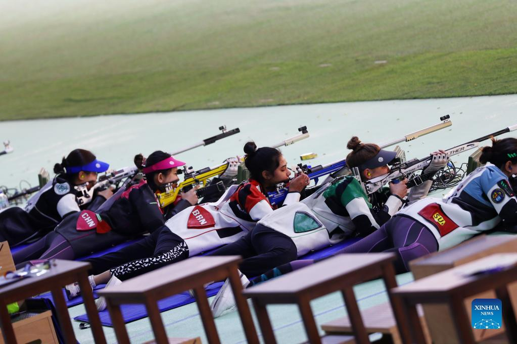 Players compete during the 50m rifle prone women junior individual match at the ISSF World Championship Rifle/Pistol in Cairo, Egypt, Oct. 13, 2022. (Xinhua/Ahmed Gomaa)