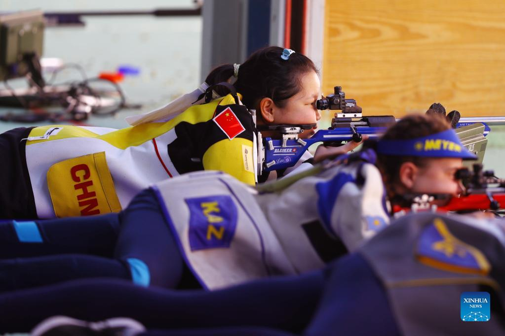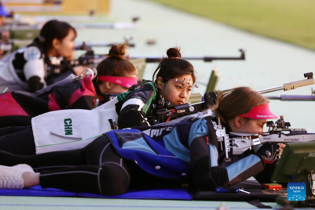 Hou Min (2nd R) of China competes during the 50m rifle prone women junior individual match at the ISSF World Championship Rifle/Pistol in Cairo, Egypt, Oct. 13, 2022. (Xinhua/Ahmed Gomaa)