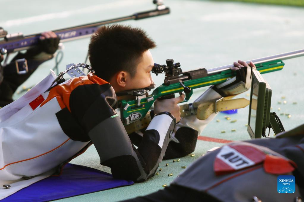 Ye Yishun of China competes during the 50m rifle prone men junior individual match at the ISSF World Championship Rifle/Pistol in Cairo, Egypt, Oct. 13, 2022. (Xinhua/Ahmed Gomaa)