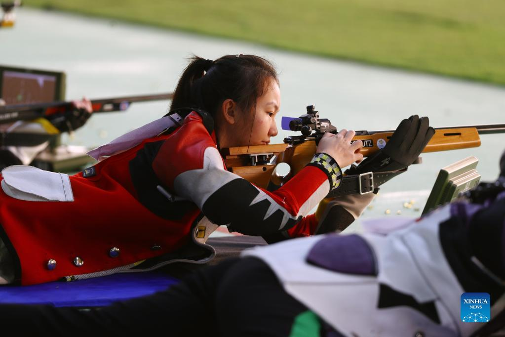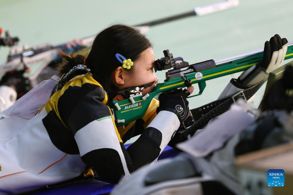 Shen Ying of China competes during the 50m rifle prone women junior individual match at the ISSF World Championship Rifle/Pistol in Cairo, Egypt, Oct. 13, 2022. (Xinhua/Ahmed Gomaa)