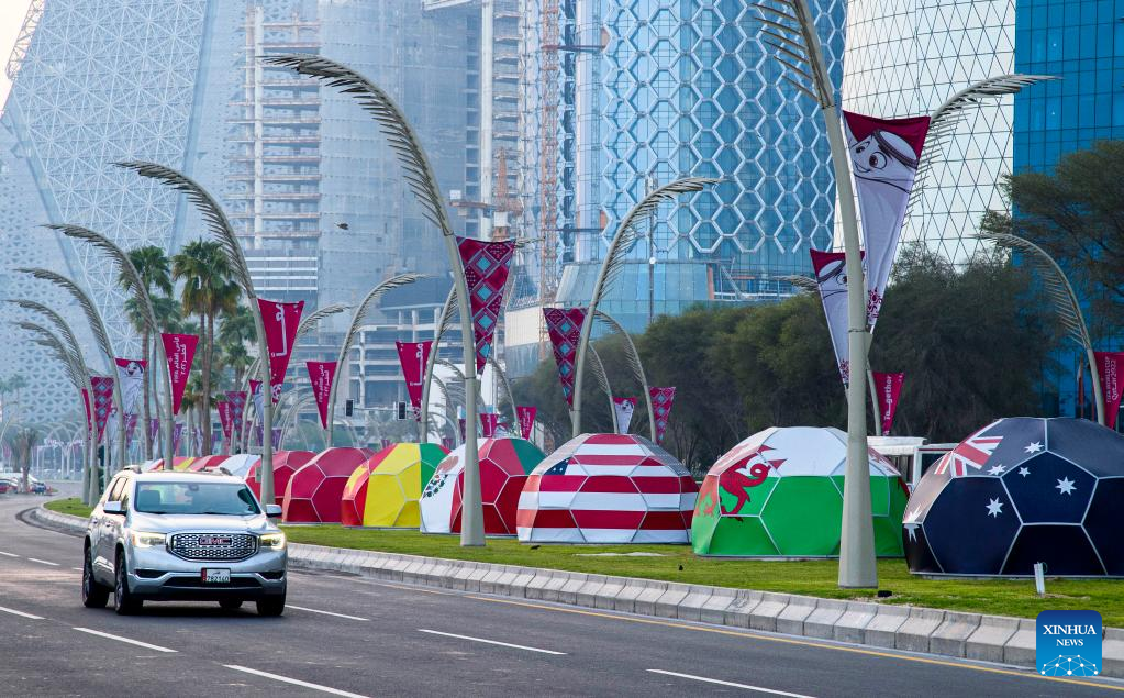 A vehicle runs past the FIFA World Cup installations in Doha, Qatar, Oct. 13, 2022. (Photo by Nikku/Xinhua)