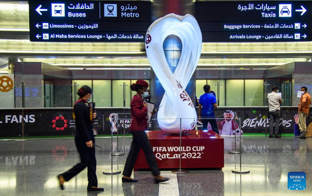 People walk past the FIFA World Cup installation at the Hamad International Airport in Doha, Qatar, Oct. 12, 2022. (Photo by Nikku/Xinhua)