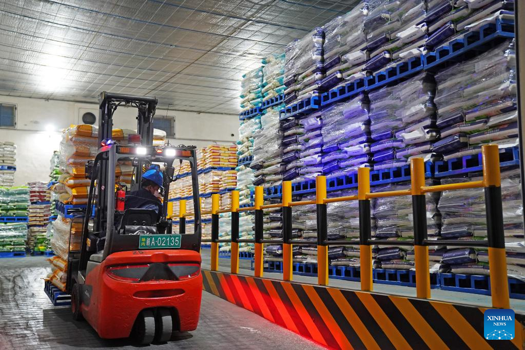 Photo taken on Oct. 11, 2022 shows a worker delivering packed rice out from storage at a grain plant in Nanchang County, east China's Jiangxi Province. World Food Day is an international day celebrated worldwide every year on Oct. 16. Each grain of rice served on human's dining-table has gone through a series of operations from the paddy fields to processing plants. (Xinhua/Wan Xiang)