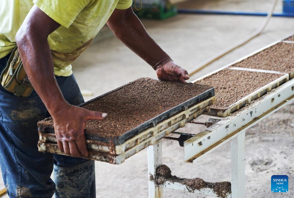 Photo taken on July 20, 2022 shows a farmer preparing for the seed germination in Nanchang County, east China's Jiangxi Province. World Food Day is an international day celebrated worldwide every year on Oct. 16. Each grain of rice served on human's dining-table has gone through a series of operations from the paddy fields to processing plants. (Xinhua/Wan Xiang)