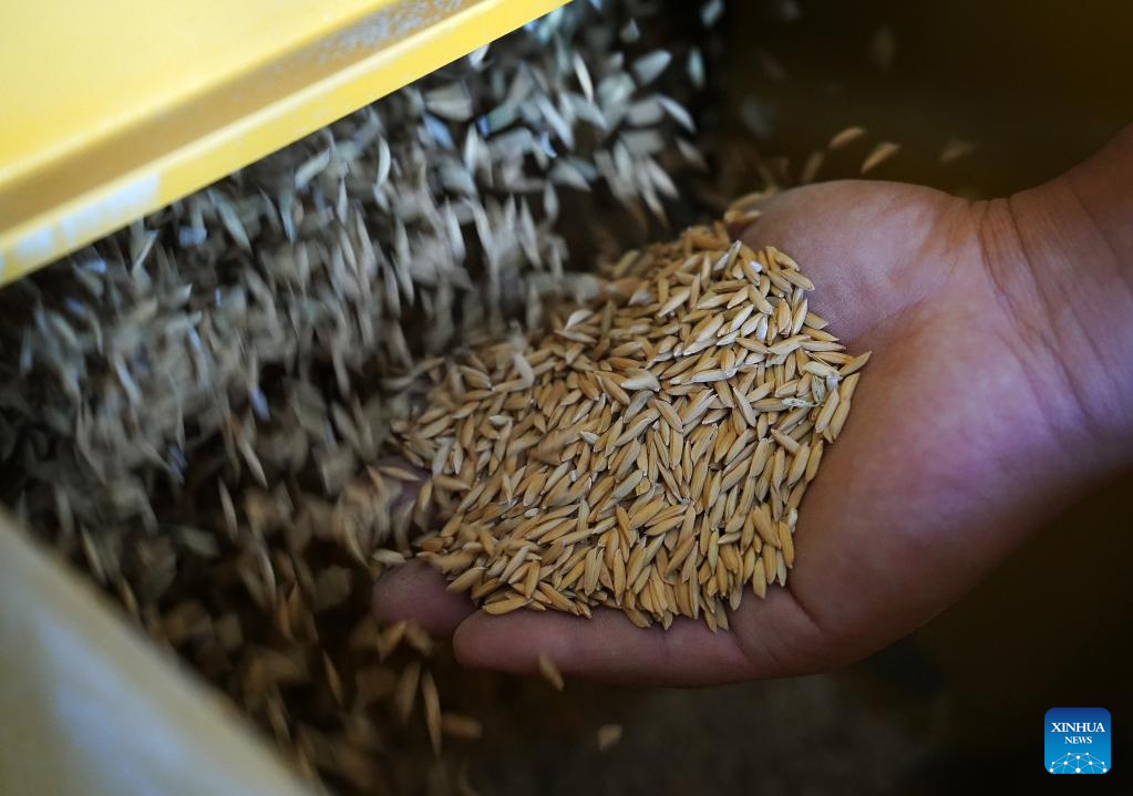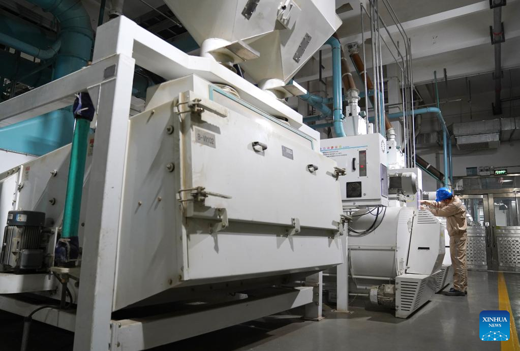 Photo taken on Oct. 11, 2022 shows dried rice at a grain plant in Nanchang County, east China's Jiangxi Province. World Food Day is an international day celebrated worldwide every year on Oct. 16. Each grain of rice served on human's dining-table has gone through a series of operations from the paddy fields to processing plants. (Xinhua/Wan Xiang)