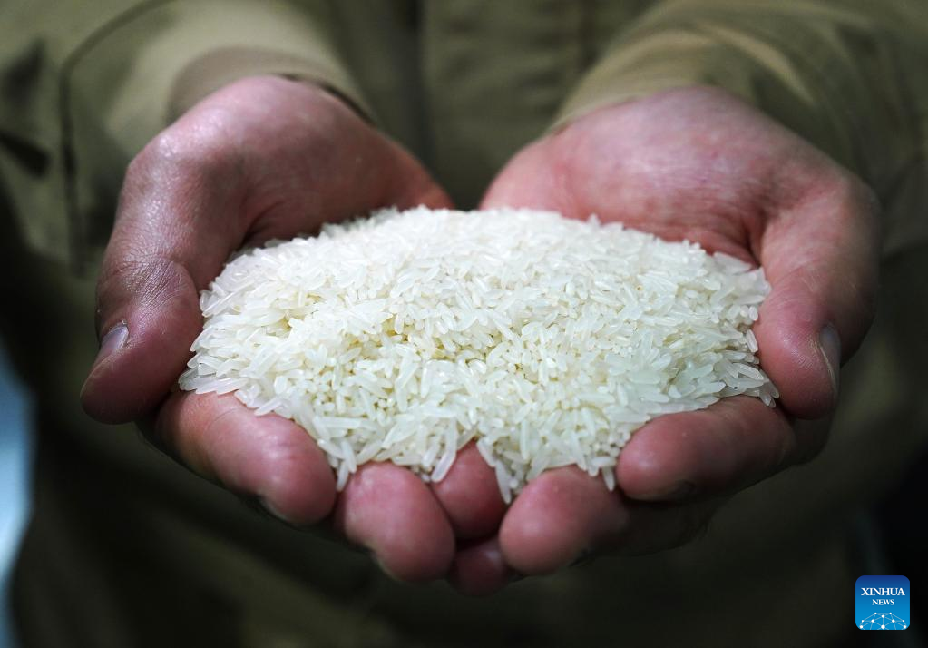 Photo taken on Oct. 11, 2022 shows a worker displaying processed rice at a grain plant in Nanchang County, east China's Jiangxi Province. World Food Day is an international day celebrated worldwide every year on Oct. 16. Each grain of rice served on human's dining-table has gone through a series of operations from the paddy fields to processing plants. (Xinhua/Wan Xiang)