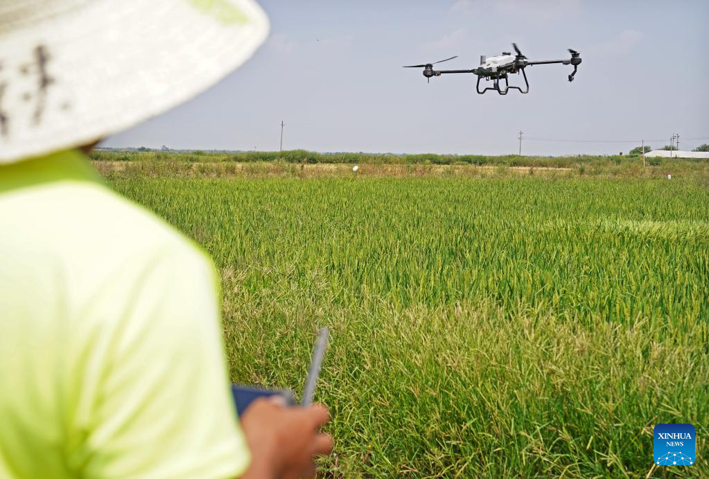 Photo taken on Sept. 16, 2022 shows a farmer operating a drone to fertilize a paddy field in Nanchang County, east China's Jiangxi Province. World Food Day is an international day celebrated worldwide every year on Oct. 16. Each grain of rice served on human's dining-table has gone through a series of operations from the paddy fields to processing plants. (Xinhua/Wan Xiang)