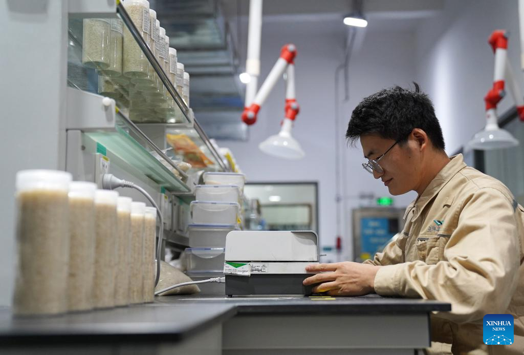 Photo taken on Oct. 11, 2022 shows a technical staff testing on processed rice at a grain plant in Nanchang County, east China's Jiangxi Province. World Food Day is an international day celebrated worldwide every year on Oct. 16. Each grain of rice served on human's dining-table has gone through a series of operations from the paddy fields to processing plants. (Xinhua/Wan Xiang)