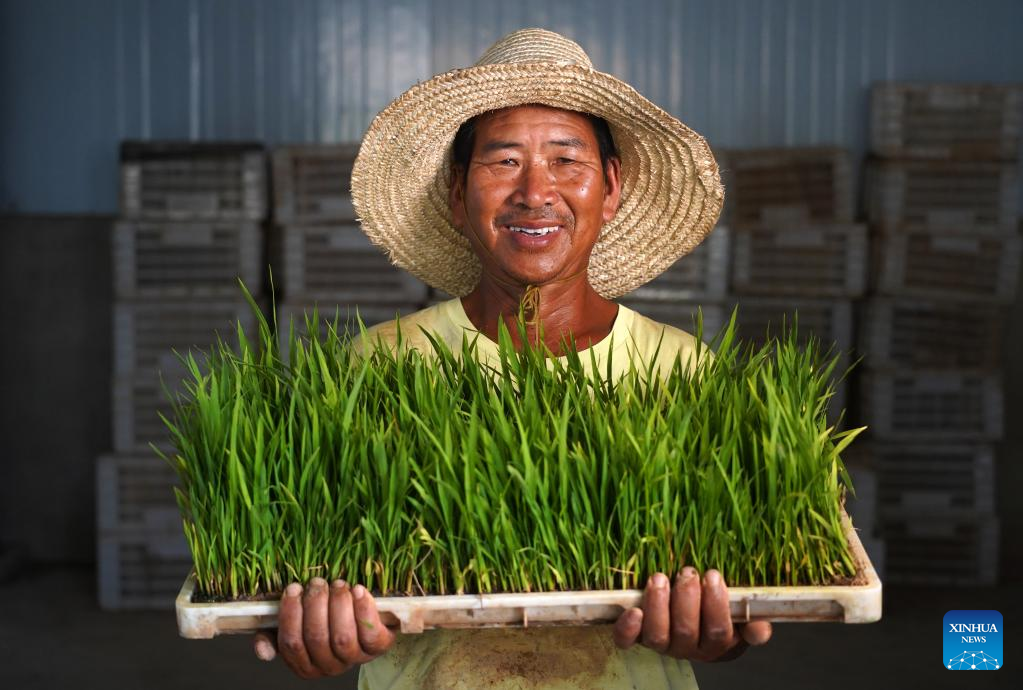 Photo taken on July 20, 2022 shows a farmer displaying rice seedlings in Nanchang County, east China's Jiangxi Province. World Food Day is an international day celebrated worldwide every year on Oct. 16. Each grain of rice served on human's dining-table has gone through a series of operations from the paddy fields to processing plants. (Xinhua/Wan Xiang)