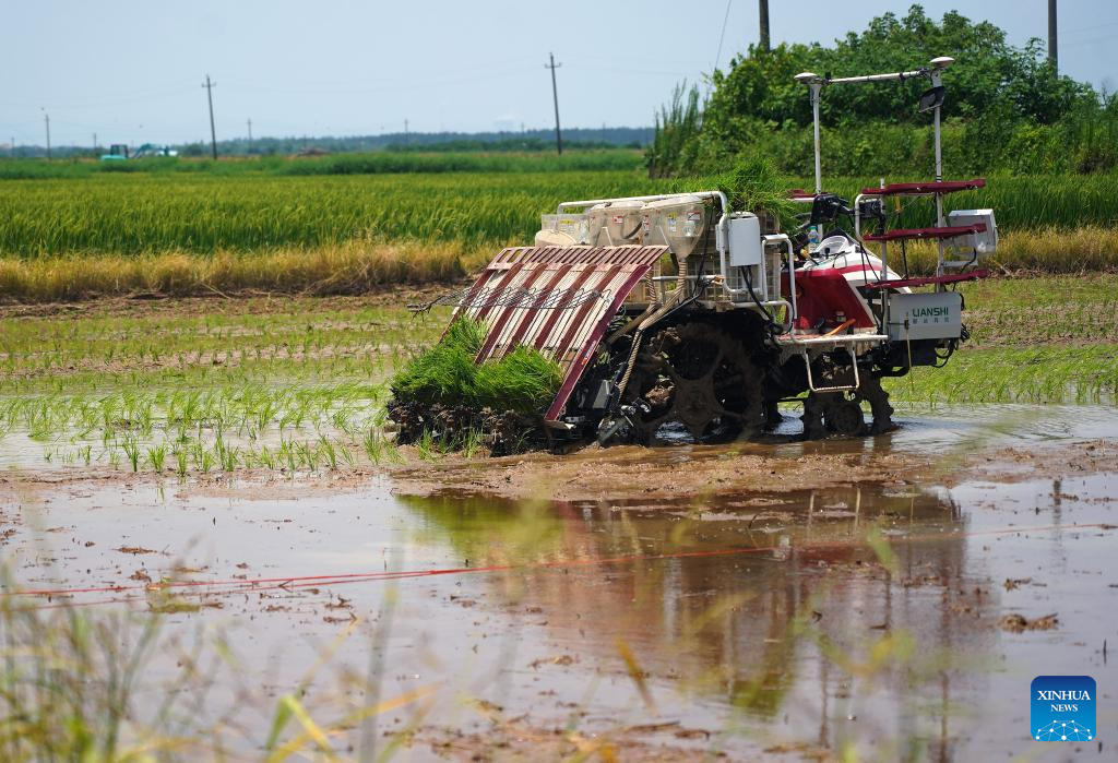 Photo taken on July 20, 2022 shows an unmanned rice transplanter transplanting rice seedlings in a paddy field in Nanchang County, east China's Jiangxi Province. World Food Day is an international day celebrated worldwide every year on Oct. 16. Each grain of rice served on human's dining-table has gone through a series of operations from the paddy fields to processing plants. (Xinhua/Wan Xiang)