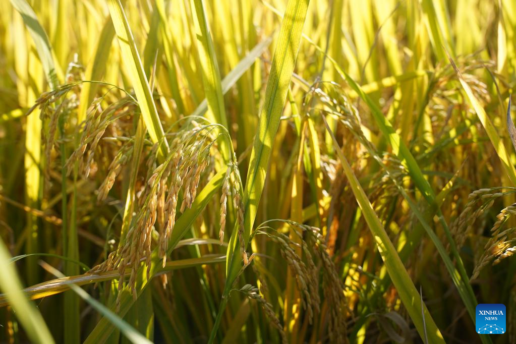 Photo taken on Oct. 11, 2022 shows ripe rice in a paddy field in Nanchang County, east China's Jiangxi Province. World Food Day is an international day celebrated worldwide every year on Oct. 16. Each grain of rice served on human's dining-table has gone through a series of operations from the paddy fields to processing plants. (Xinhua/Wan Xiang)