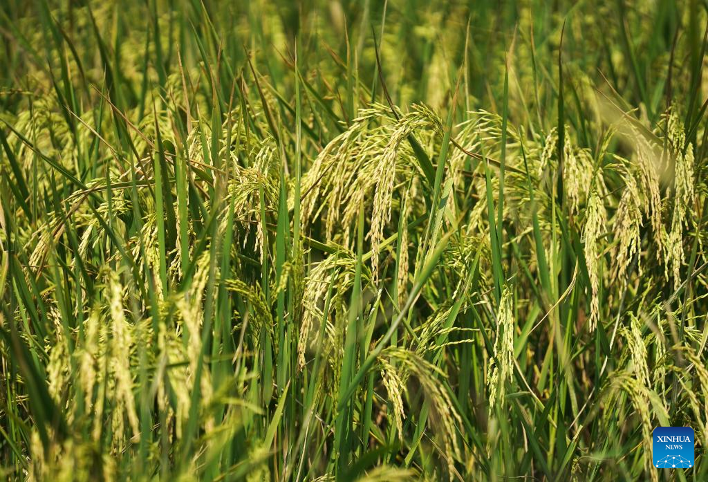 Photo taken on Sept. 16, 2022 shows rice that has entered the grain filling stage in a paddy field in Nanchang County, east China's Jiangxi Province. World Food Day is an international day celebrated worldwide every year on Oct. 16. Each grain of rice served on human's dining-table has gone through a series of operations from the paddy fields to processing plants. (Xinhua/Wan Xiang)