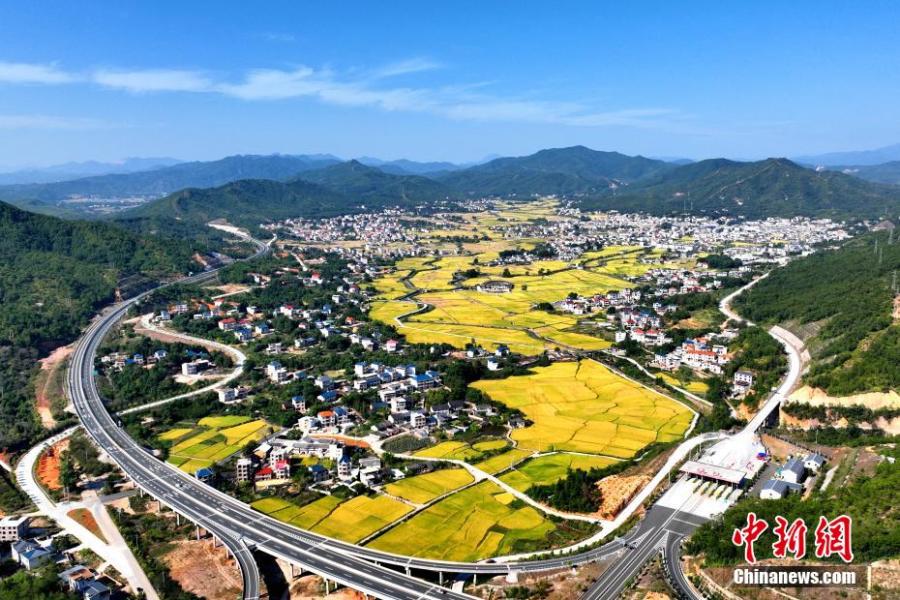 Aerial view shows picturesque scene of golden terraced fields in Shanghang County of Longyan City, east China's Fujian Province, Oct. 13, 2022. More than 1,500 hectares of paddy rice entered harvest. (Photo: China News Service/Zhang Jinchuan)
