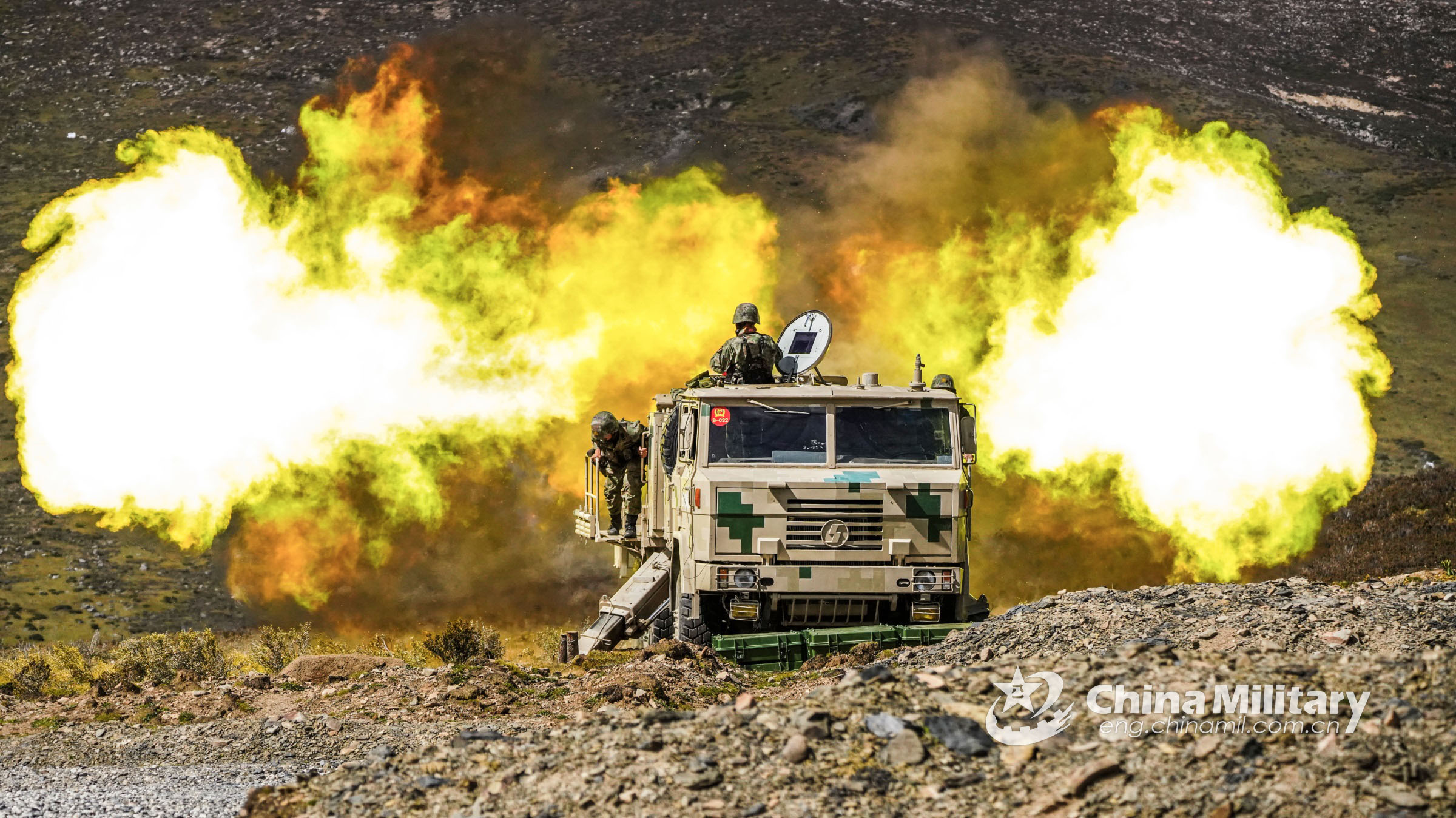 A truck-mounted howitzer attached to a brigade under the PLA 77th Group Army spits fire during a live-fire assessment on September 17, 2022. (eng.chinamil.com.cn/Photo by Liu Yanhong)