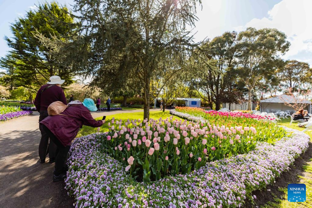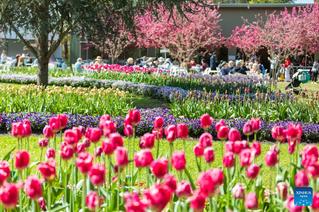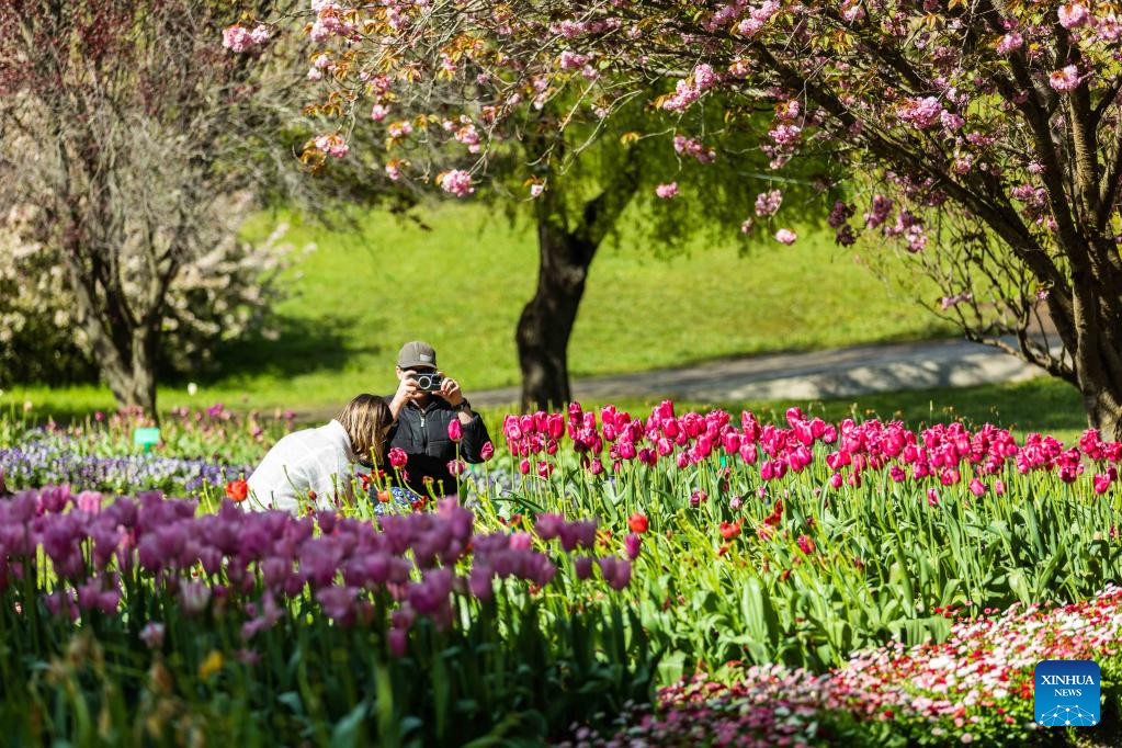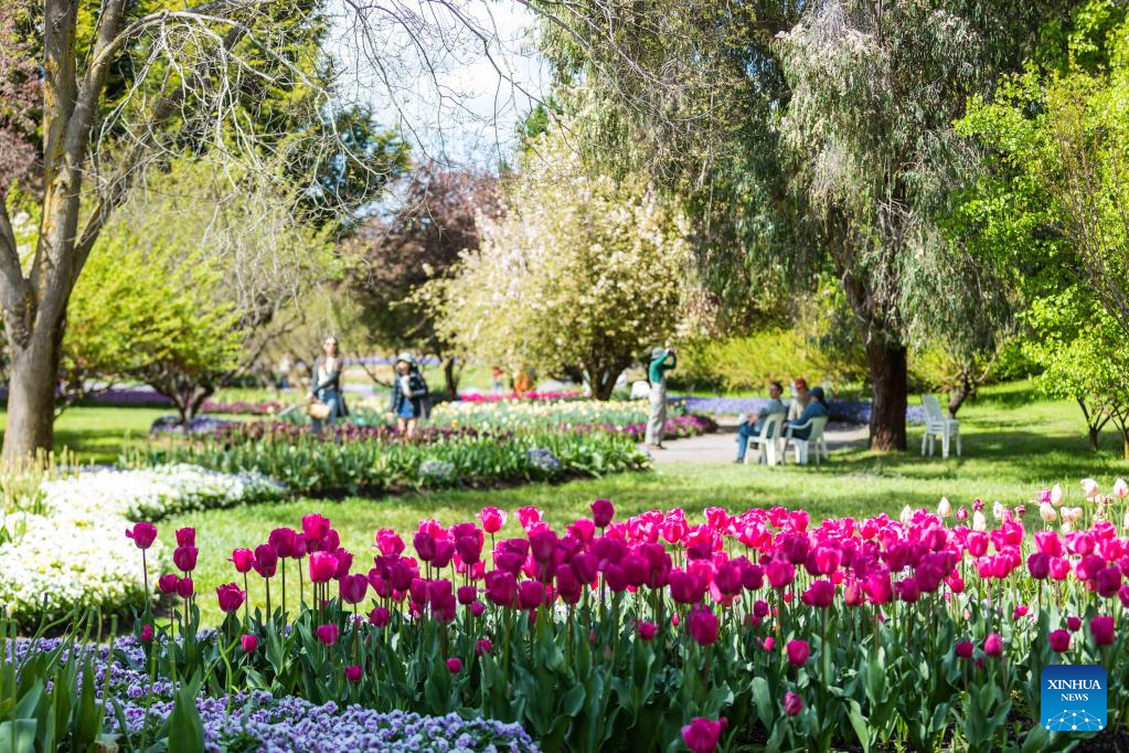 Photo taken on Oct. 15, 2022 shows blooming tulips and visitors at a garden in the suburb of Canberra, Australia. (Photo by Chu Chen/Xinhua)