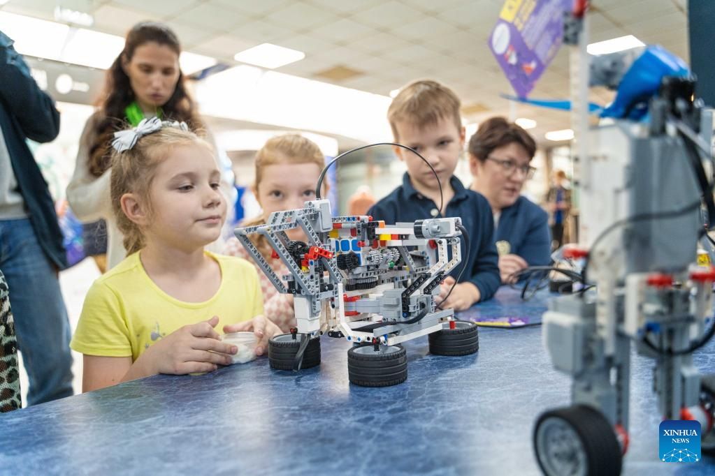 A Rubik's Cube robot catches children's attention during a science festival held by Vladivostok State University in Vladivostok, Russia, Oct. 15, 2022. (Photo by Guo Feizhou/Xinhua)