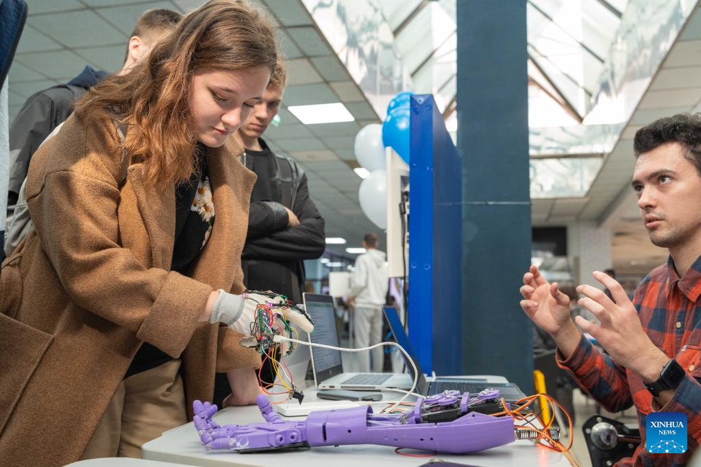 A woman tries out a robotic hand during a science festival held by Vladivostok State University in Vladivostok, Russia, Oct. 15, 2022. (Photo by Guo Feizhou/Xinhua)