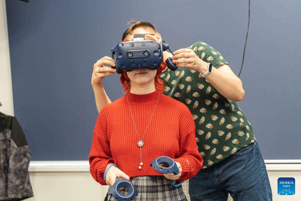 A staff member helps a visitor put on VR glasses during a science festival held by Vladivostok State University in Vladivostok, Russia, Oct. 15, 2022. (Photo by Guo Feizhou/Xinhua)