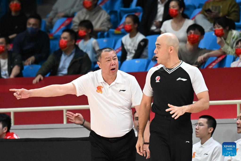 Wu Qinglong (L), head coach of Shenzhen Leopards, talks to referee during the 3rd round match between Guangdong Southern Tigers and Shenzhen Leopards at the 2022-2023 season of the Chinese Basketball Association (CBA) league in Hangzhou, east China's Zhejiang Province, Oct. 15, 2022. (Xinhua/Chen Zhenhai)