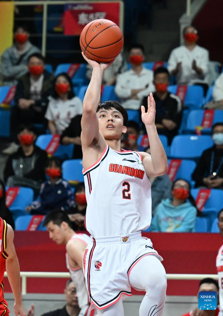 Xu Jie of Guangdong Southern Tigers shoots the ball during the 3rd round match between Guangdong Southern Tigers and Shenzhen Leopards at the 2022-2023 season of the Chinese Basketball Association (CBA) league in Hangzhou, east China's Zhejiang Province, Oct. 15, 2022. (Xinhua/Chen Zhenhai)
