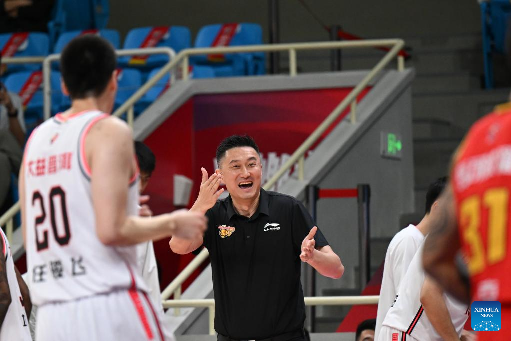 Du Feng, head coach of Guangdong Southern Tigers, gestures during the 3rd round match between Guangdong Southern Tigers and Shenzhen Leopards at the 2022-2023 season of the Chinese Basketball Association (CBA) league in Hangzhou, east China's Zhejiang Province, Oct. 15, 2022. (Xinhua/Chen Zhenhai)