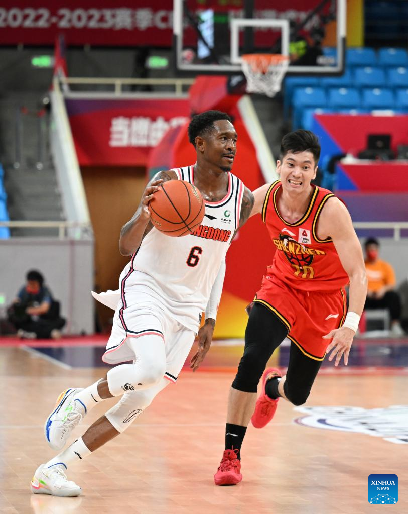 Marshon Brooks (L) of Guangdong Southern Tigers breaks through under the defence of Bai Haotian of Shenzhen Leopards during the 3rd round match between Guangdong Southern Tigers and Shenzhen Leopards at the 2022-2023 season of the Chinese Basketball Association (CBA) league in Hangzhou, east China's Zhejiang Province, Oct. 15, 2022. (Xinhua/Chen Zhenhai)