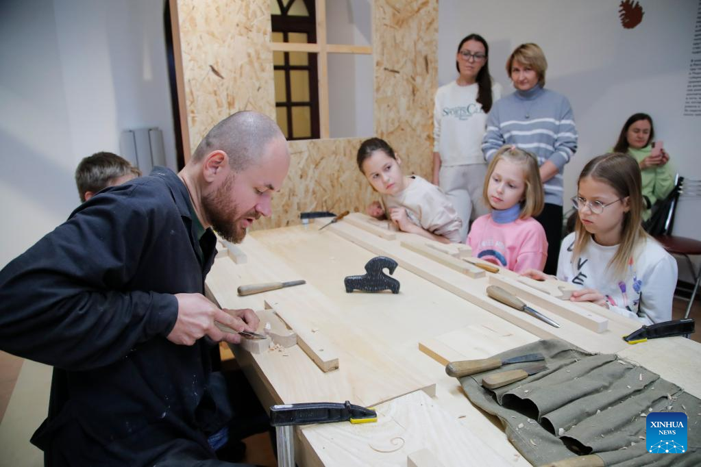 People take part in a toy-making workshop at a wooden toys exhibition in Moscow, Russia, Oct. 15, 2022. (Photo by Alexander Zemlianichenko Jr/Xinhua)
