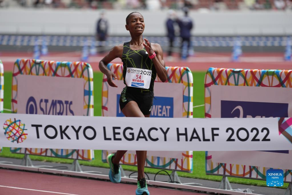Caroline Nyaga of Kenya dashes to the finish line during the Tokyo Legacy Half 2022 marathon in Tokyo, Japan, on Oct. 16, 2022. (Xinhua/Zhang Xiaoyu)