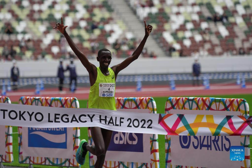 Kipkemoi Vincent of Kenya dashes to the finish line during the Tokyo Legacy Half 2022 marathon in Tokyo, Japan, on Oct. 16, 2022. (Xinhua/Zhang Xiaoyu)