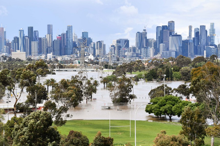 Photo taken on Oct. 14, 2022, shows a flooded area in Victoria, Australia. (Photo by Bai Xue/Xinhua)