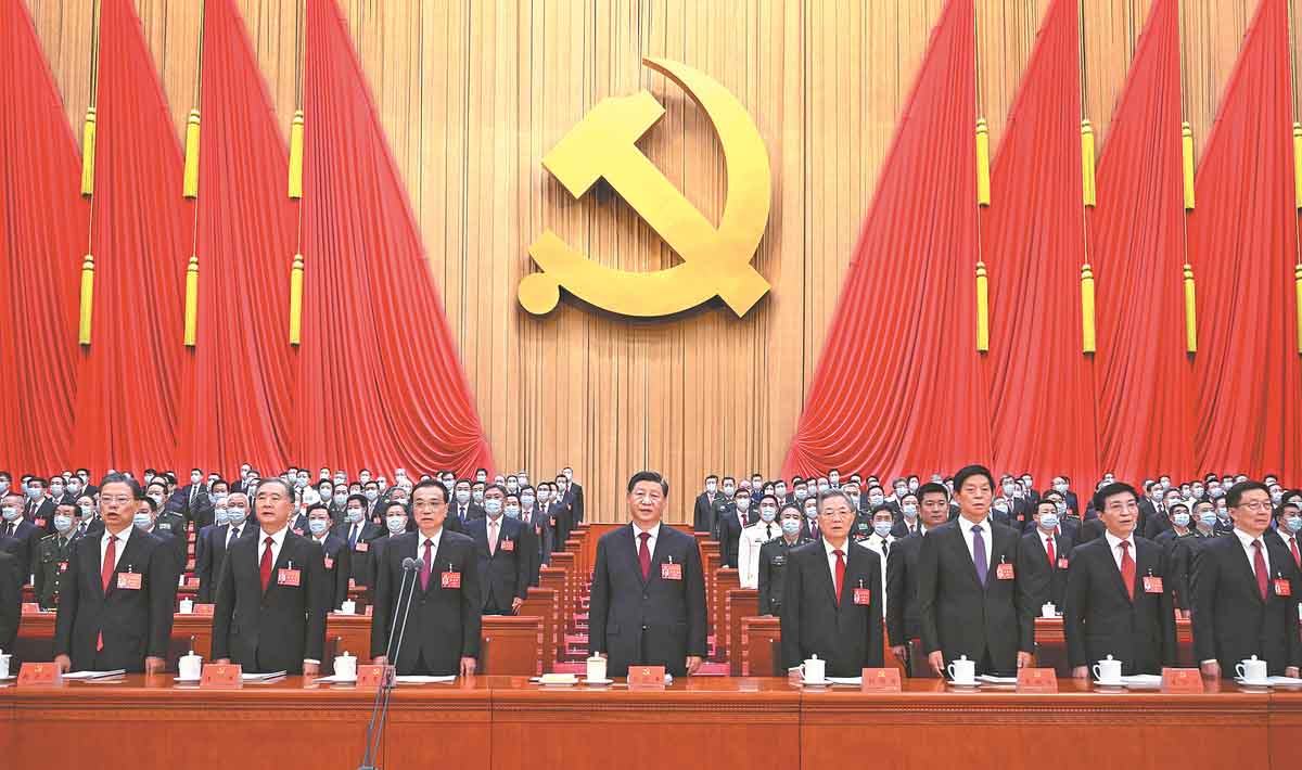 Xi Jinping and former and incumbent leaders of the Communist Party of China participate in the opening session of the 20th CPC National Congress at the Great Hall of the People in Beijing on Sunday. LI XUEREN/XINHUA