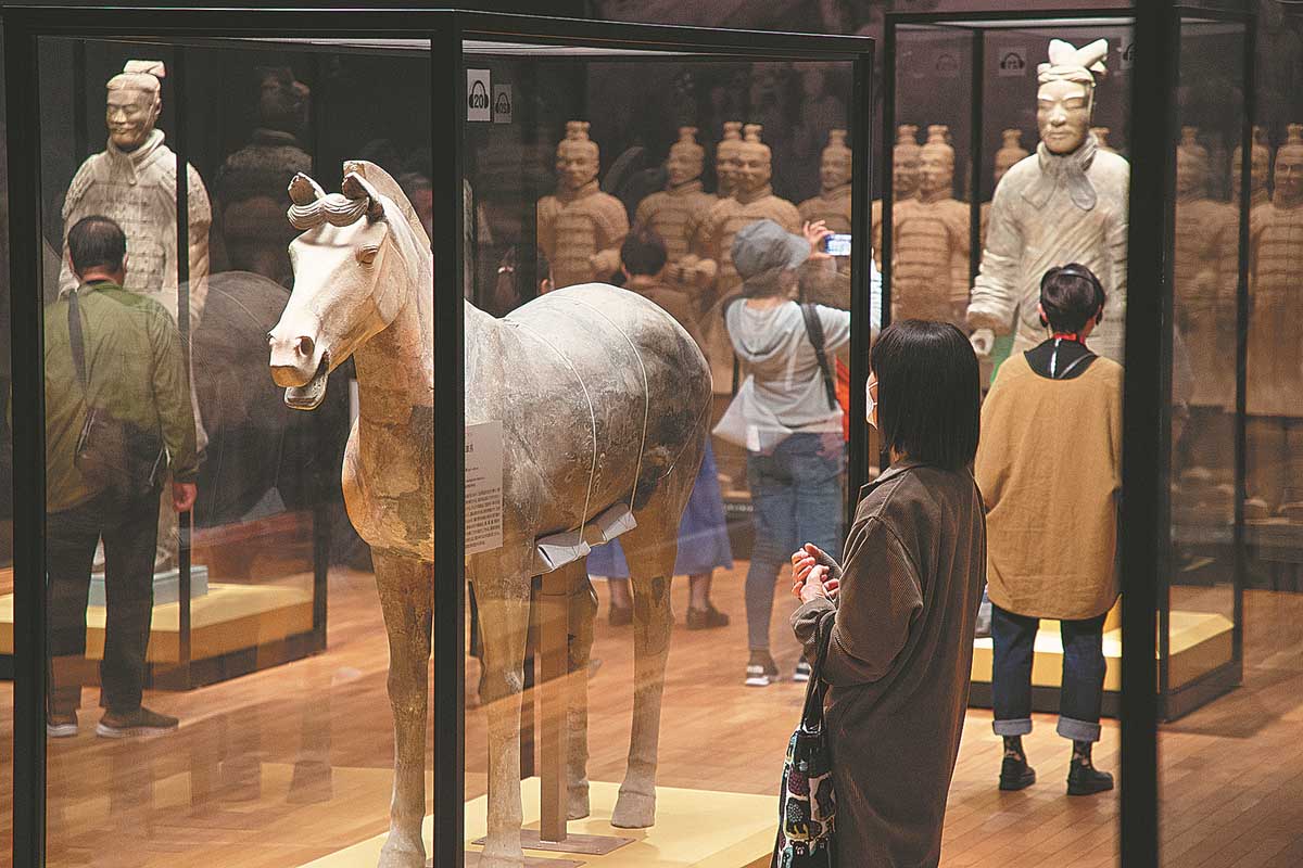 Visitors admire artifacts in an exhibition Terracotta Warriors and Ancient China — Heritage from the Qin and Han Dynasty at Kyoto City KYOCERA Museum of Art on March 25. [Photo/Xinhua]