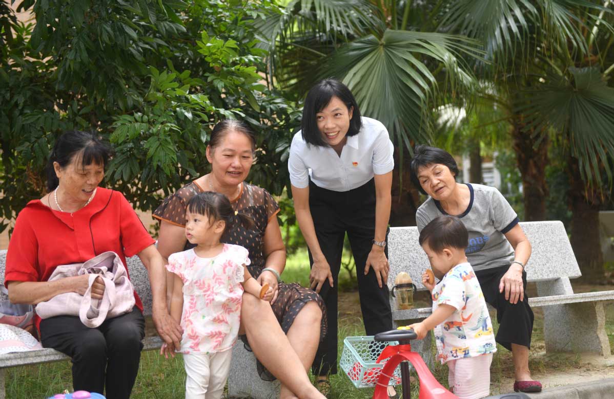 Lu Xiuxing (center), Party secretary of Guzao village in Foshan, Guangdong province, meets residents on Sept 7, 2022. [Photo/Xinhua]