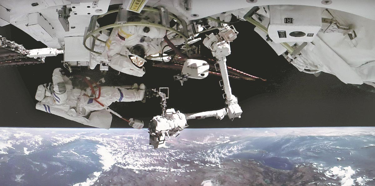 China's Shenzhou XIV astronauts Chen Dong (right) and Liu Yang exit the space station lab module Wentian on Sept 1, and use a robotic arm to install new instruments outside the Tiangong space station. This photo has been inverted top to bottom. XU BU/FOR CHINA DAILY