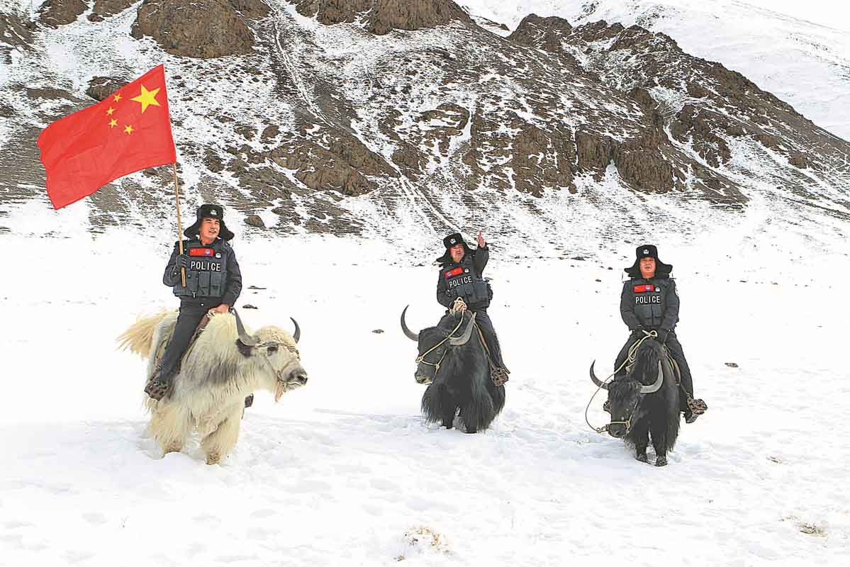 Officers from the Aranbaotai guard post at the immigration police station in Teznap, a township in Kashgar prefecture, Xinjiang Uygur autonomous region, ride yaks as they patrol the China-Tajikistan border in December. CHINA DAILY
