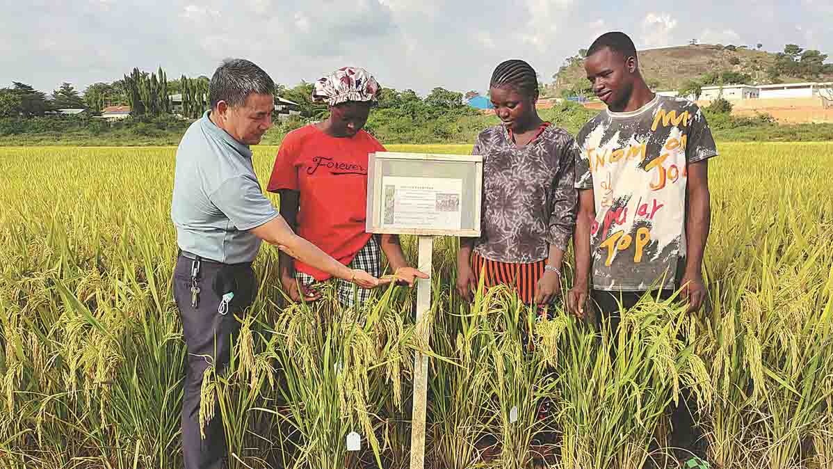 A Chinese expert checks the growth of rice with farmers in Abuja, Nigeria. Rice planted at four demonstration fields all produced good harvests this year. [Photo/CHINA DAILY]