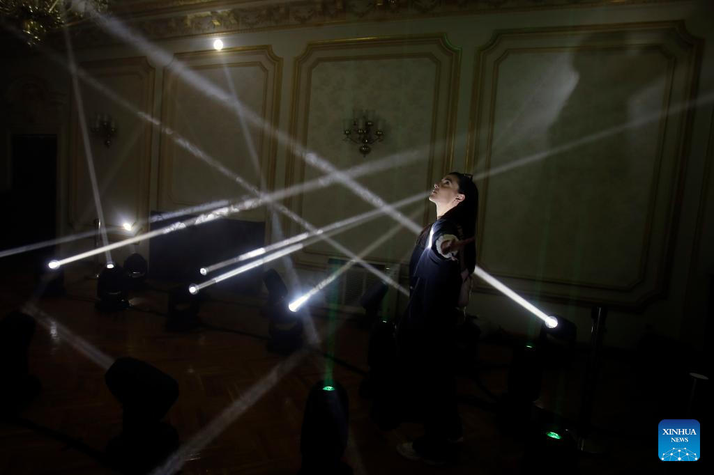 A woman enjoys an interactive light installation while visiting the 3rd edition of the new media art festival RADAR in Bucharest, capital of Romania, Oct. 16, 2022. (Photo by Cristian Cristel/Xinhua)